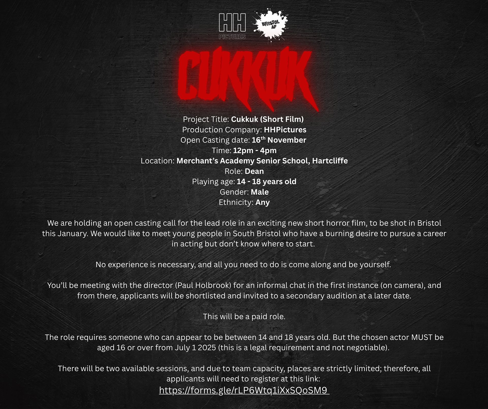 Bristol AF have partnered with HH Pictures to produce an exciting new horror short shooting in Bristol early next year. We're on the hunt for exciting young talent from the Westcountry!